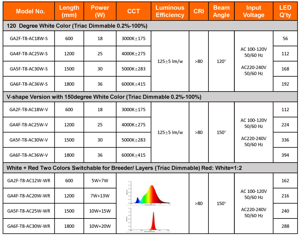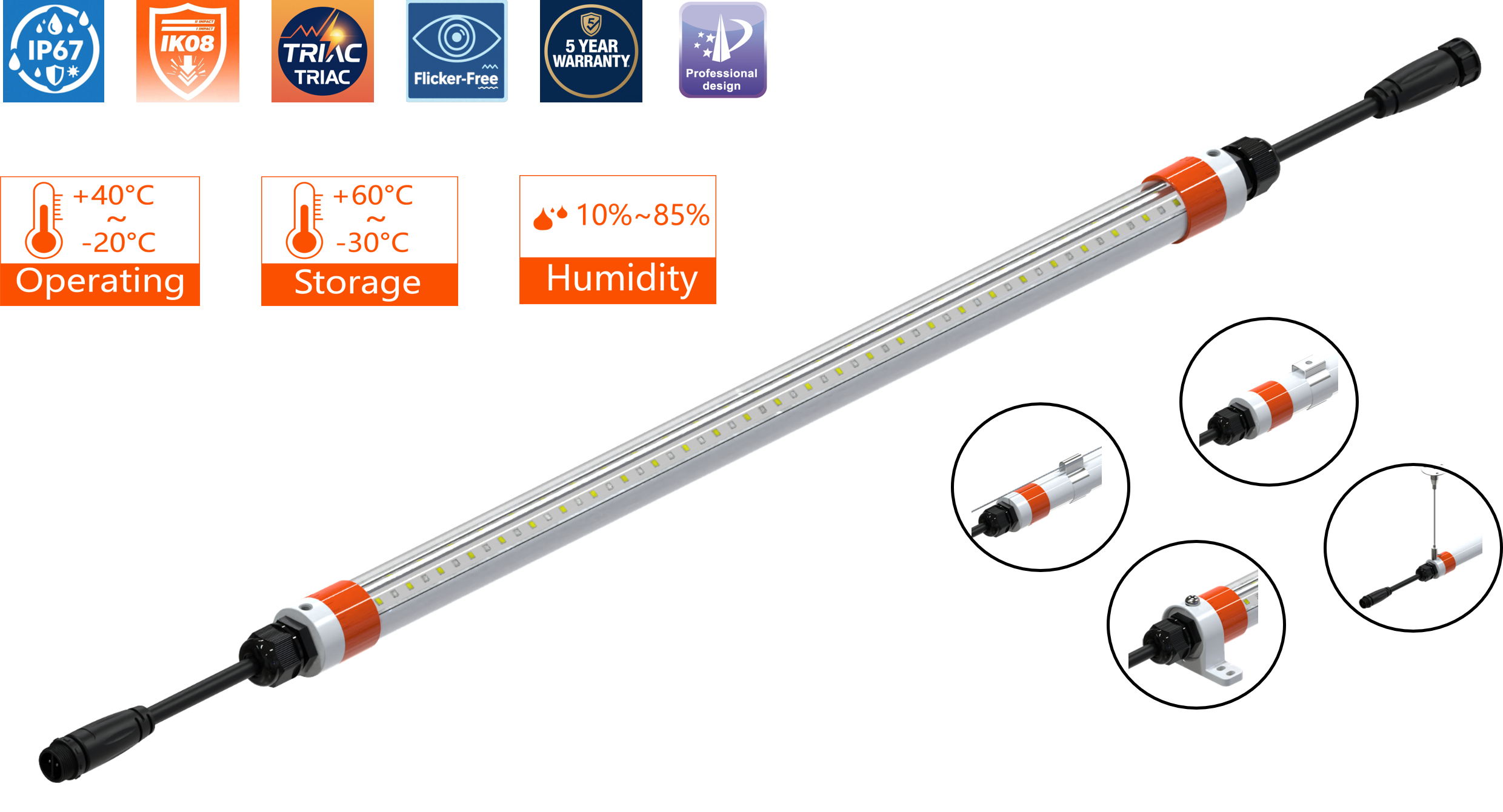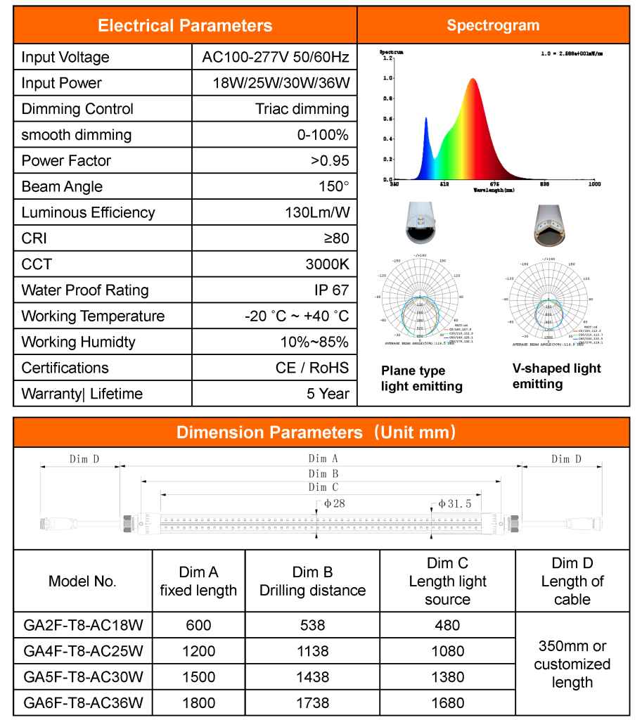 18W~30W,0-100% TriAC Dimming,120Lm/W,IP67 WaterProof,Rotatable Illumination Angle,Plug-and-Play Easy Installation,T8 Tube Lamp